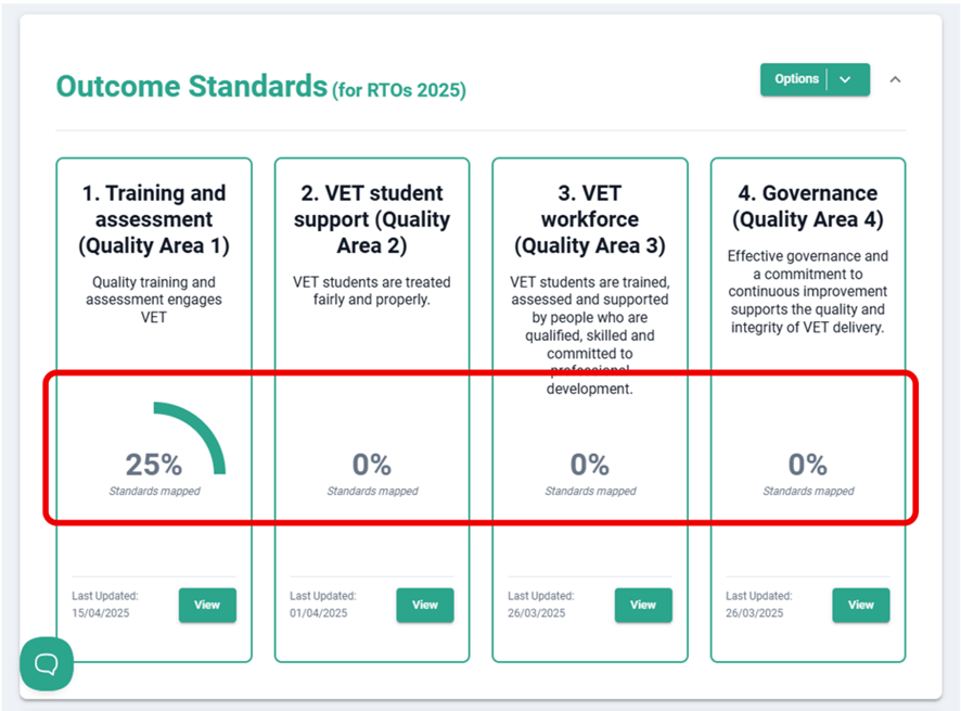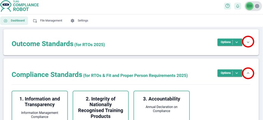 - The Dashboard: This is where you access the Standards sections: Outcome Standards and Compliance Standards.