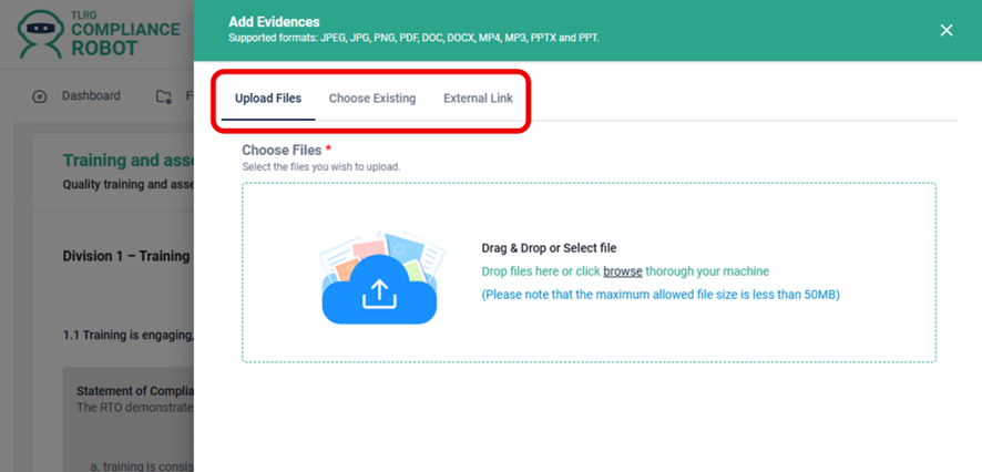 The Compliance Robot System allows you to attach evidence as files, links or images and to provide justifications for how the evidence shows that each requirement is addressed.