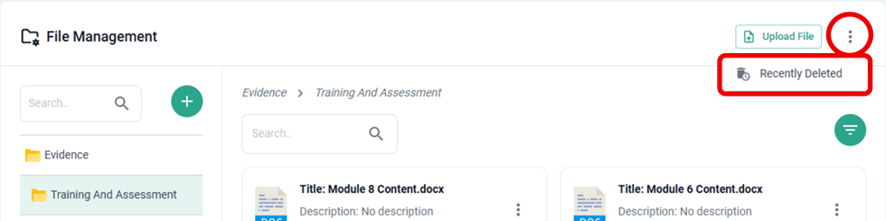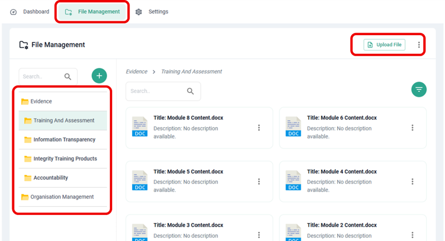 Any evidence attached to requirements is filed and can be viewed via the File Management menu item. You can view existing items via the folders, upload files, or create new folders ( + button above the folders).