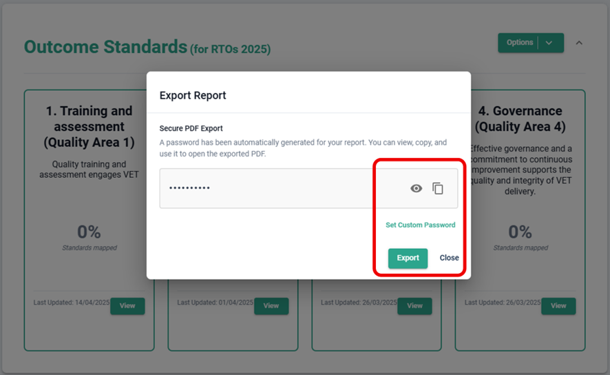 Use or nominate a password, copy the password and export the report as a pdf download.