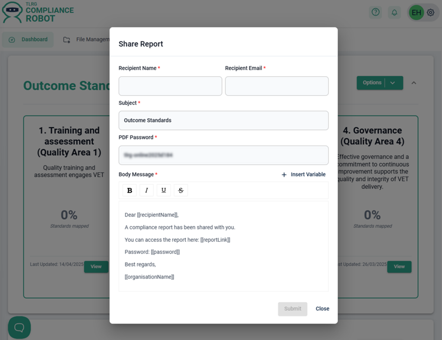 Enter the recipient details (name and email address), set the password or edit the email body message and then click Submit to send the report.
