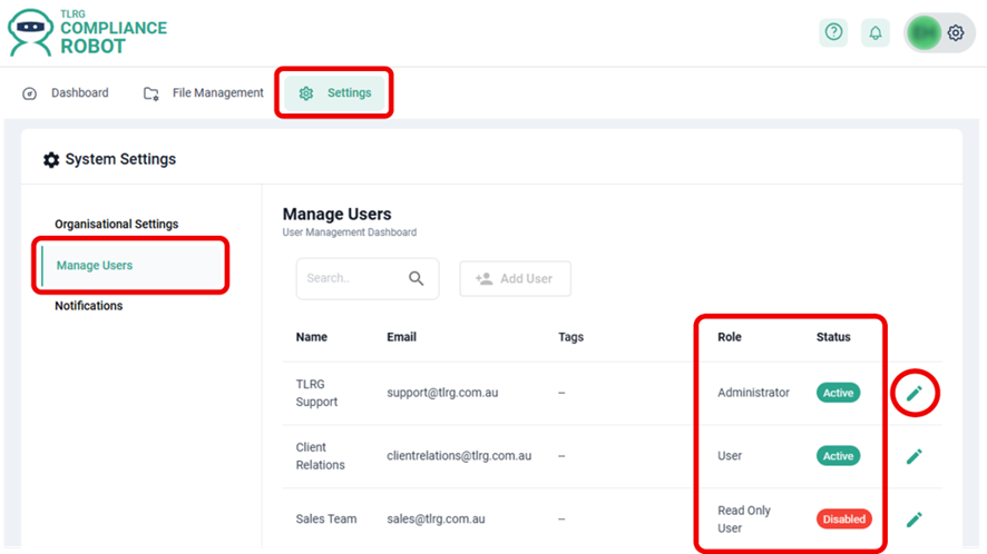 - System Settings: Manage your Organisational Settings and Profile, Manage Users, and Notification settings.