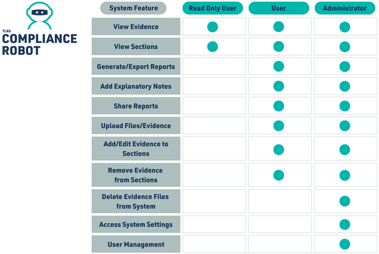 There are 3 user role access levels available, the functions of which are shown in the below table.